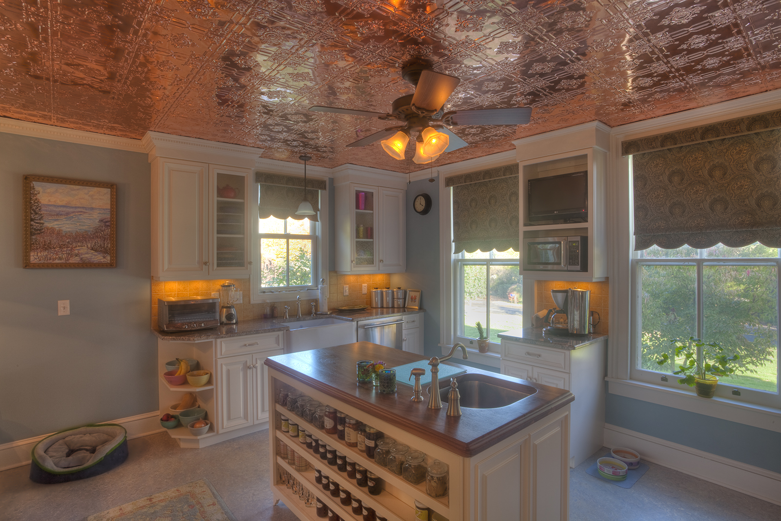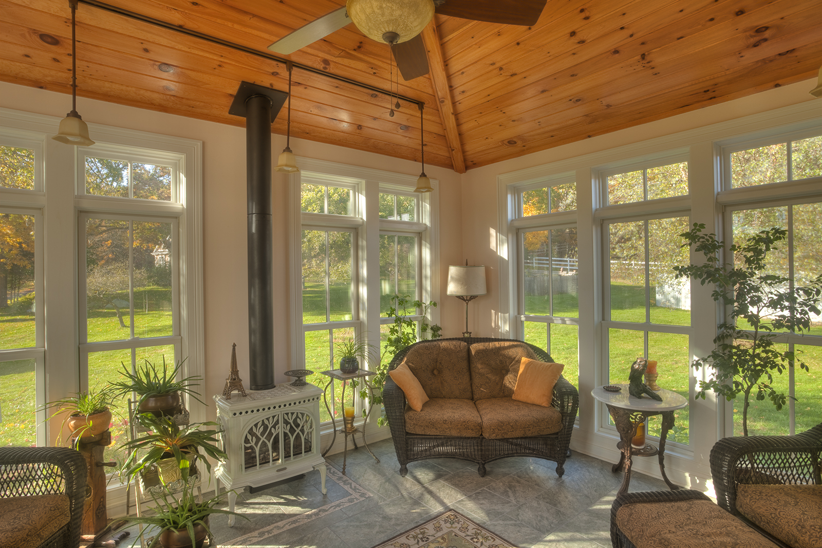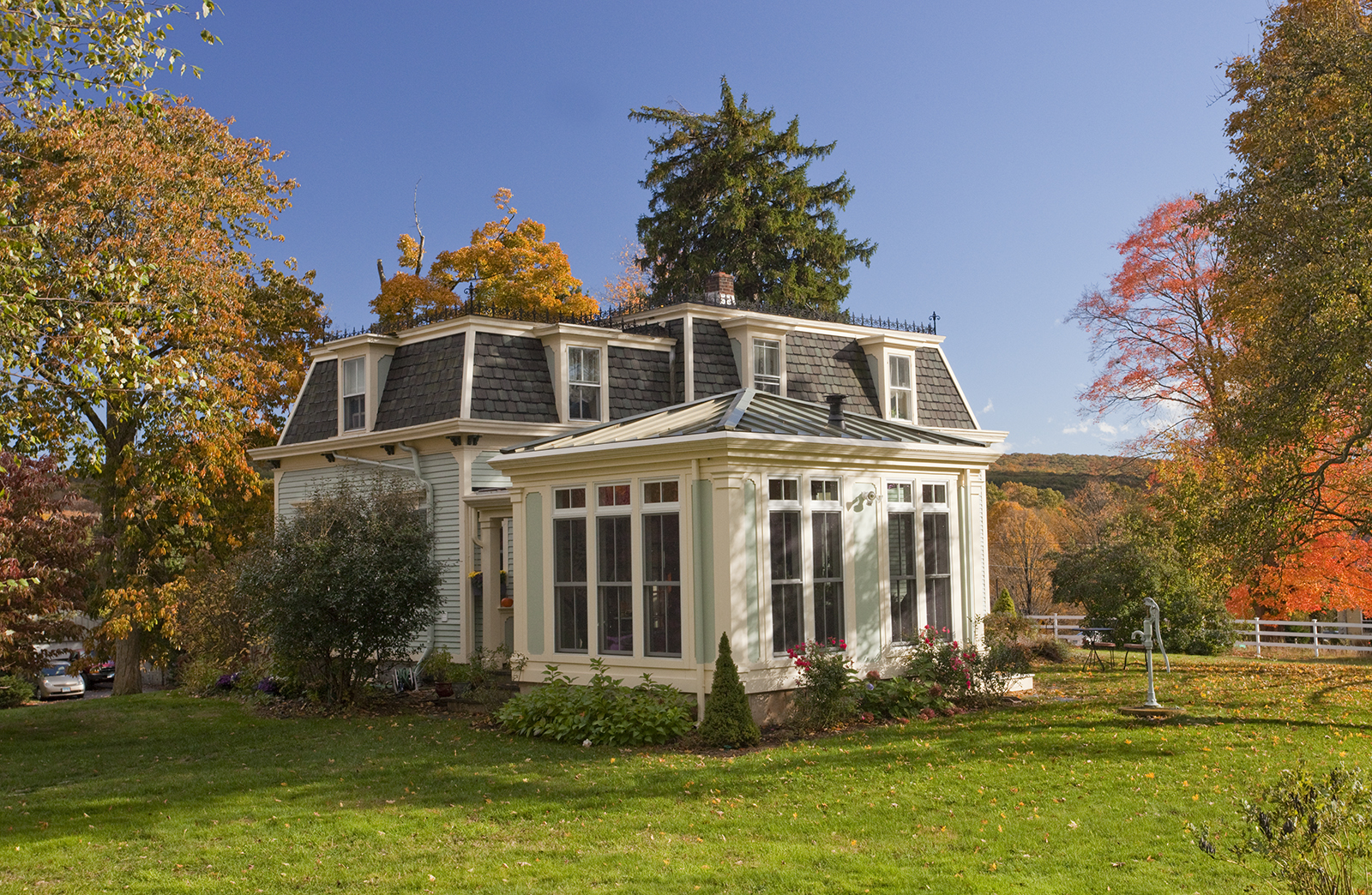 This Victorian 2nd Empire style house offers a vernacular vocabulary for the design of this project. The renovation includes a complete interior remodeling of the kitchen along with a new built-in dining niche. The 416 s.f. expansion includes a new entry with porch, Orangerie, laundry, storage, and ½ bath, as well as a pathway to the kitchen. The orangerie form consists of a rectangular box with articulated panels and tall, slender windows. In turn, it is capped with a metal-seam pyramid roof. The interior of the orangerie is showered with ample natural light and the pine ceiling offers a generous sense of space. Furthermore, the copper finish ceiling of the kitchen seems to glow as it reflects the interior elements. Low-E glass and spray foam insulation effectively provide energy efficiency. Ultimately, this unique addition provides spatial and functional improvements, as well as a quintessential modern interpretation of Victorian 2nd Empire architecture to enhance this historical house.